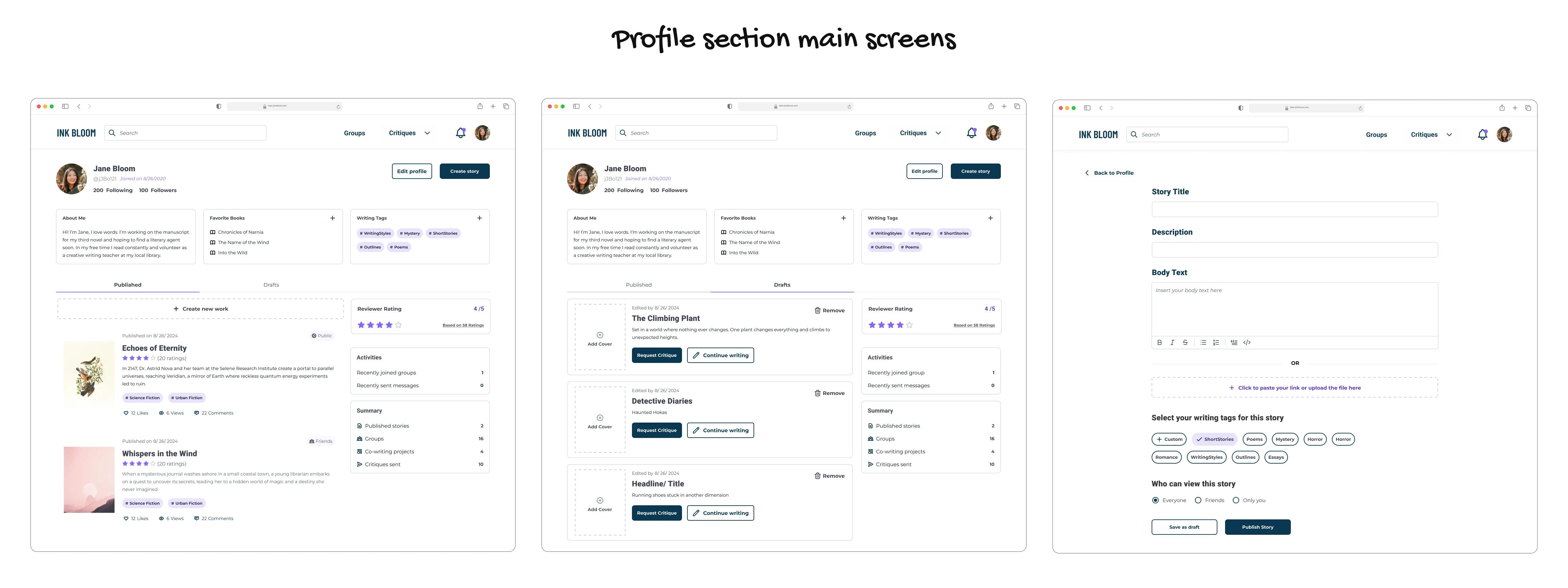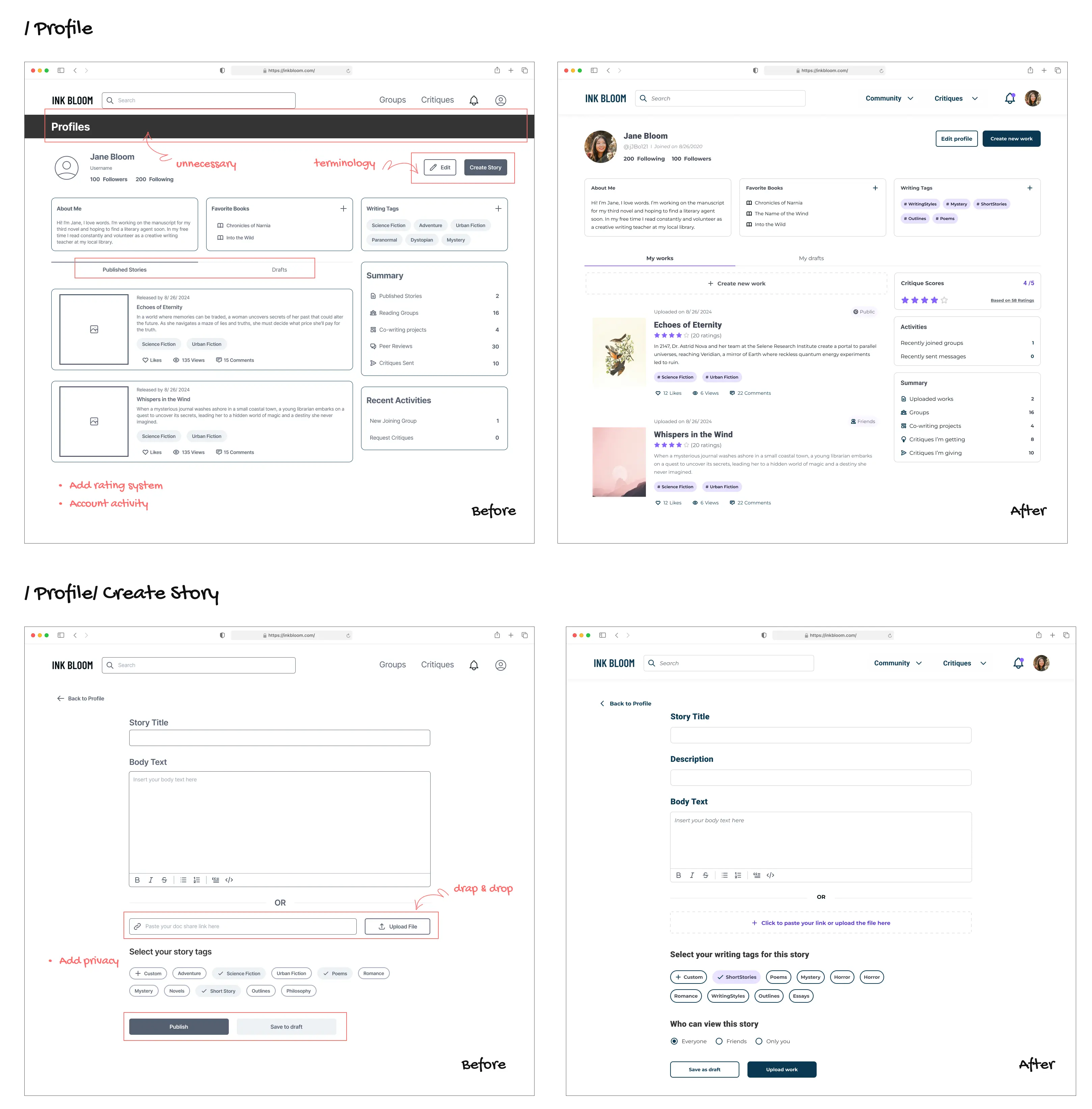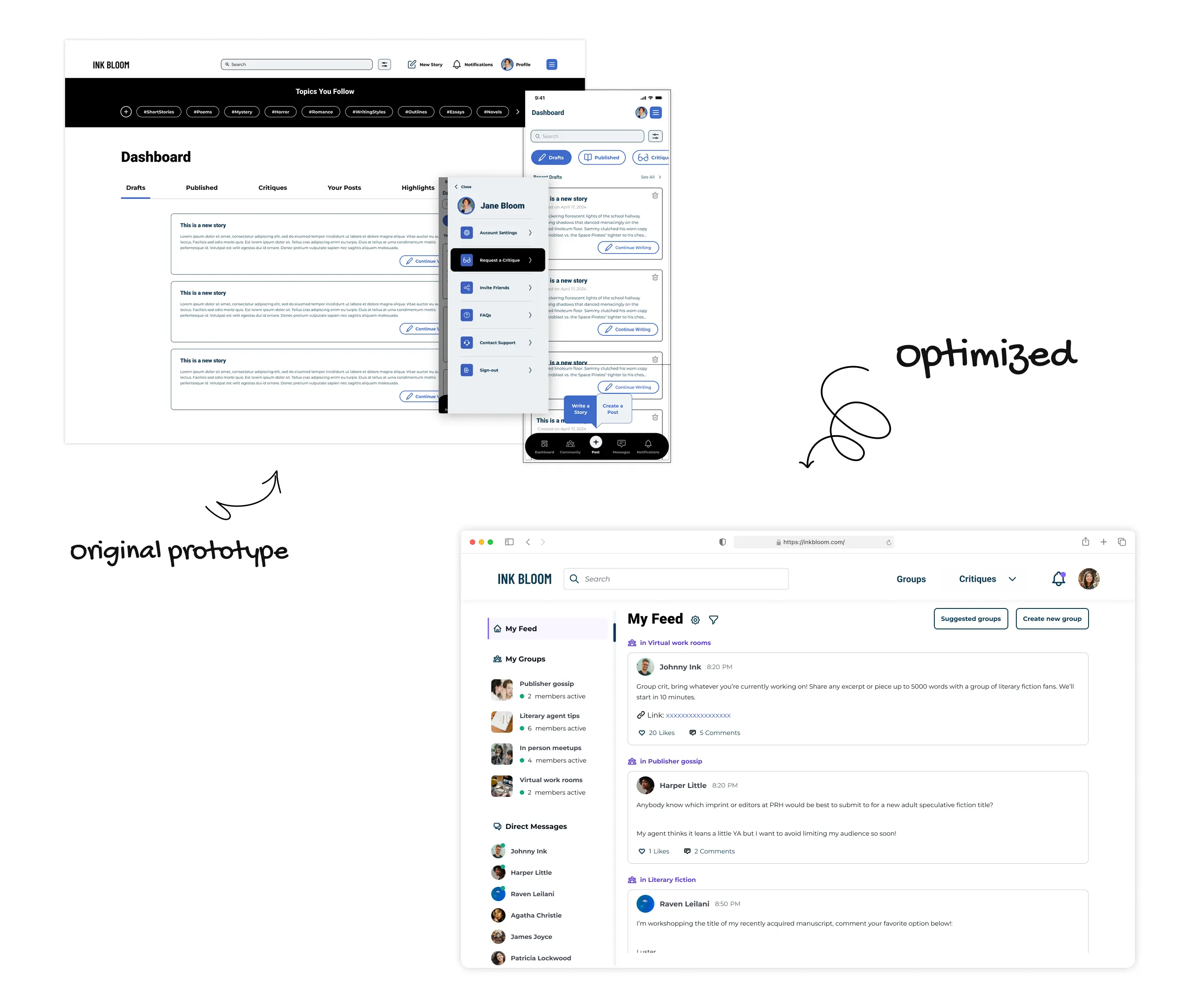 Ink Bloom, a community platform, empowers writers to flourish by connecting them with a vibrant network of fellow creators and experts. The founder Dr. Ray Hsu, aims to gather insights from users to shape a clear roadmap for the MVP launch. The project goal was to optimize and simplify existing user flows to define the essentials for the MVP.