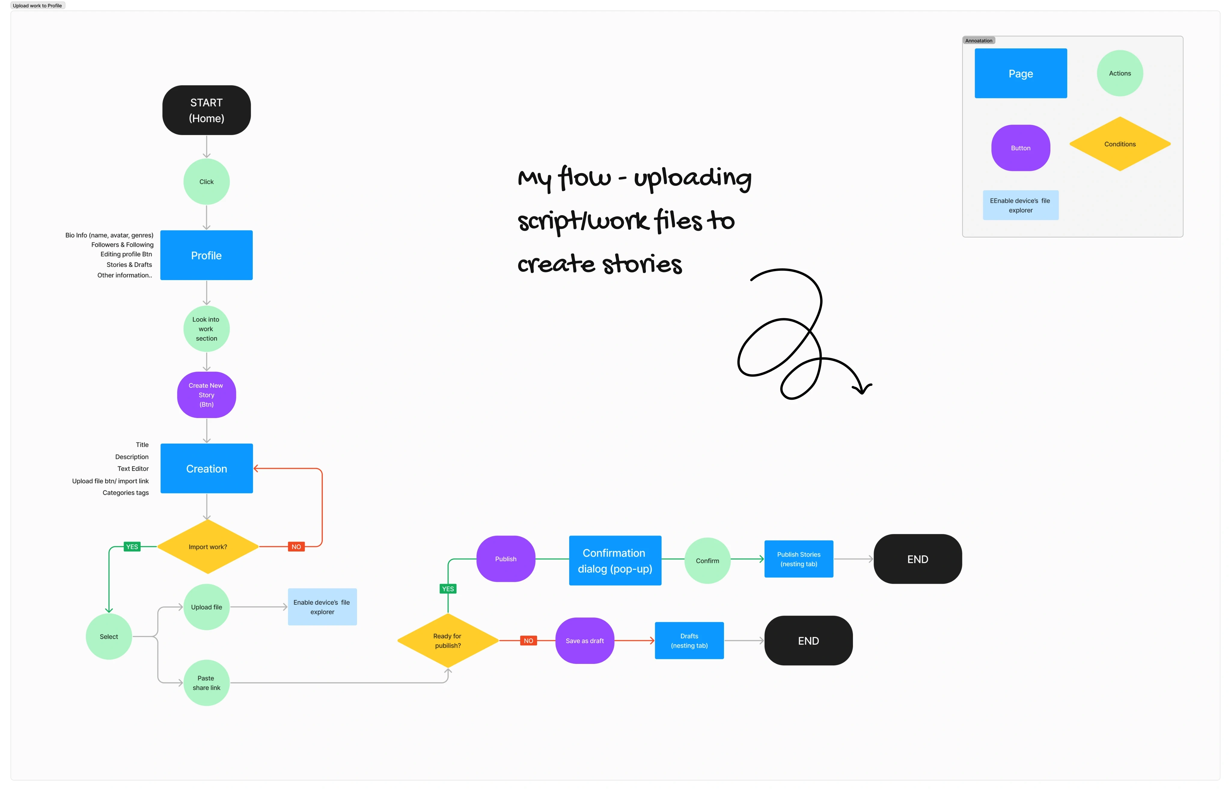 We each took responsibility for sketching out those user flow screens for further wireframe designs (see other flows here), and my task was to work on the Profile section, which involves the flow of uploading script/work files.